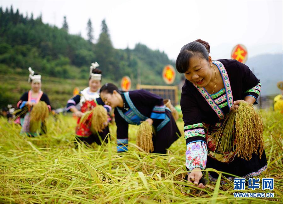 10月11日,在广西龙胜各族自治县平等镇广南侗寨,村民在稻田里剪禾。 金秋时节,地处广西龙胜各族自治县高寒山区的单季稻香禾糯迎来丰收季,侗族同胞用传统方式剪禾、挑禾、晒禾,侗寨里处处是丰收的景象。 新华社发(黄勇丹 摄)