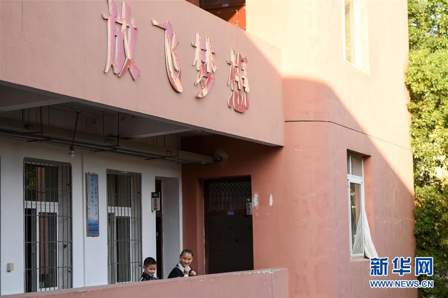 10月10日,在安庆市特殊教育学校教学楼走廊,张晨(右)与盲生柯洋交流。新华社记者张端摄