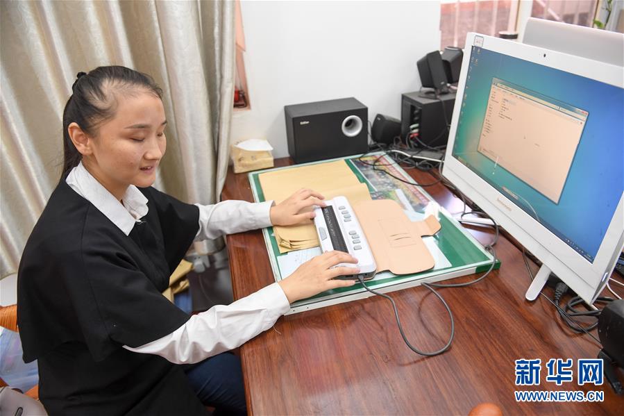 10月10日,在安庆市特殊教育学校的办公室里,张晨使用点显器阅读电脑上的文字资料。新华社记者张端摄