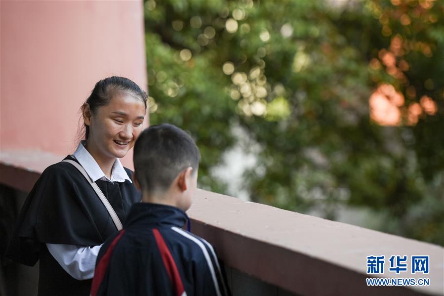 10月10日,在安庆市特殊教育学校教学楼走廊,张晨(左)与盲生柯洋交流。新华社记者张端摄