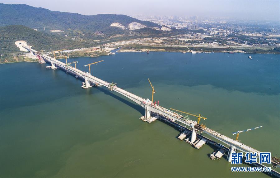 10月12日,崔家营汉江特大桥顺利合龙(无人机拍摄)。 当日,位于湖北襄阳的汉(武汉)十(十堰)高铁崔家营汉江特大桥成功合龙,标志着汉十高铁全线贯通。由中铁大桥局承建的崔家营汉江特大桥,全长13013米,是汉十高铁跨越汉江的关键控制性工程,计划于2019年年底建设完成。 新华社记者肖艺九摄