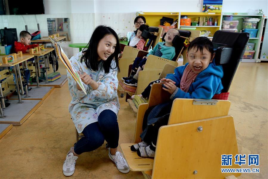 西安市儿童福利院阳光班心愿组的老师给正在进行引导式康复训练的残疾孩子讲绘本(5月11日摄)。新华社记者 刘潇 摄