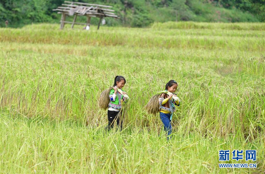 10月12日,在广西融水苗族自治县良寨乡大里村,小朋友背着刚刚收割的紫黑香糯回家。新华社记者 黄孝邦 摄