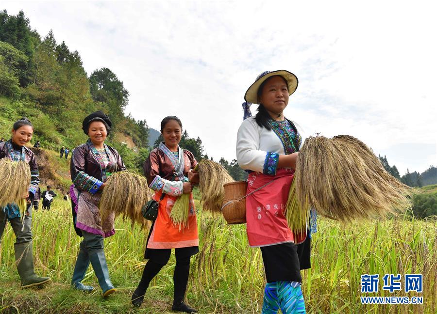 10月12日,在广西融水苗族自治县良寨乡大里村,苗家妇女在文化节上参加紫黑香糯收割比赛。 新华社记者 黄孝邦 摄