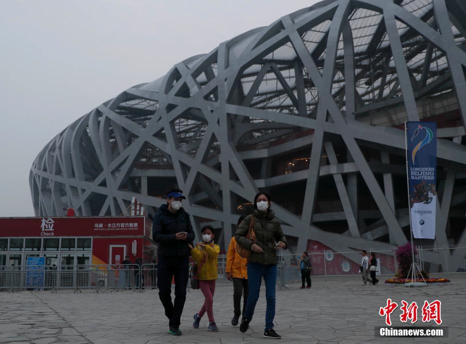 10月14日,游客在北京国家体育场附近游玩。北京市环境保护监测中心的实时监测数据显示,当日19时北京空气质量达重度污染,实时空气质量指数211,首要污染物为PM2.5。中新社记者 刘关关 摄