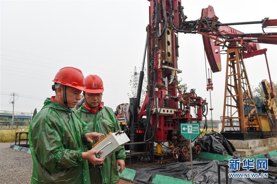 田明(左)与团队工作人员在江苏真武油田井场现场调试设备(10月9日摄)。 他就是田明,从油田里成长起来的大国工匠。 新华社记者 李博 摄