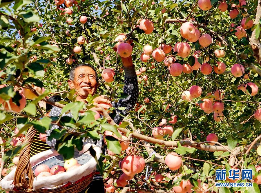 秦皇岛市抚宁区大新寨镇梁家湾村的果农在果园采摘苹果(10月14日摄)。 近年来,河北省秦皇岛市抚宁区引导农民利用燕山浅山丘陵地发展林果种植业,既带动农民致富,又绿化了荒山。目前该区果树种植面积达30万亩,年产各类果品近20万吨。