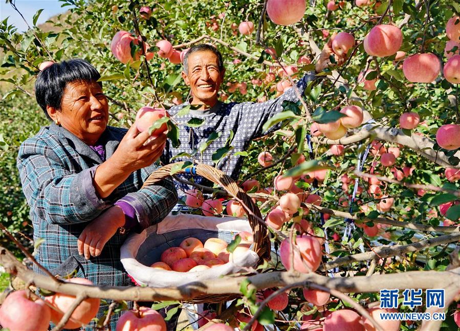 秦皇岛市抚宁区大新寨镇梁家湾村的果农在果园采摘苹果(10月14日摄)。 近年来,河北省秦皇岛市抚宁区引导农民利用燕山浅山丘陵地发展林果种植业,既带动农民致富,又绿化了荒山。目前该区果树种植面积达30万亩,年产各类果品近20万吨。