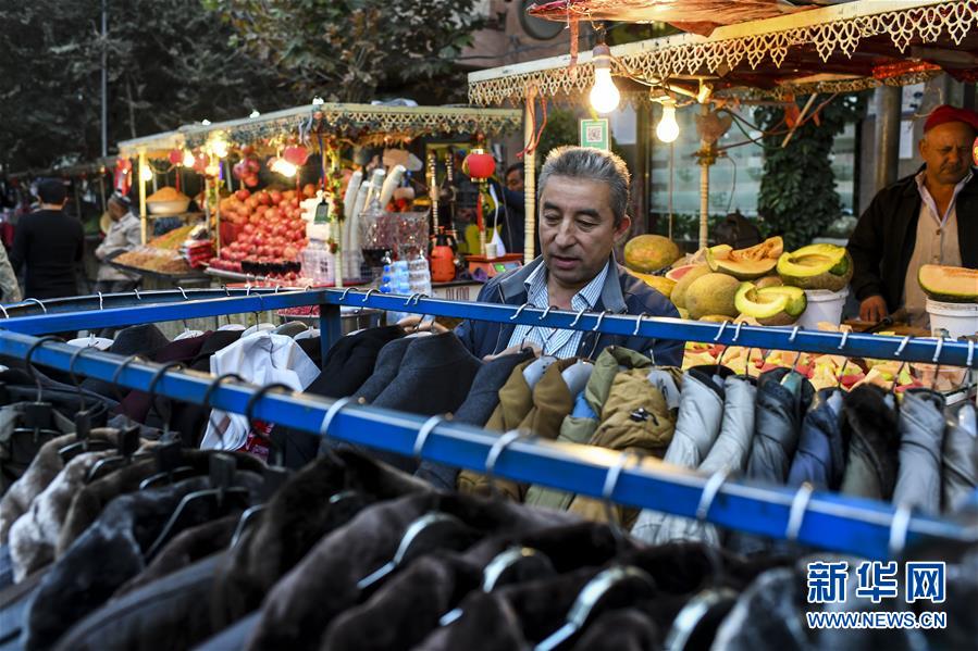 10月16日,一位喀什老城居民在流动摊位上选购服装。 深秋时节,新疆喀什气候宜人,居民与游客在老城内悠闲享受秋日时光。 新华社记者 胡虎虎 摄