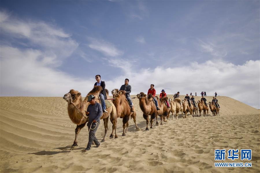 10月16日,游客在罗布人村寨里骑着骆驼游览。