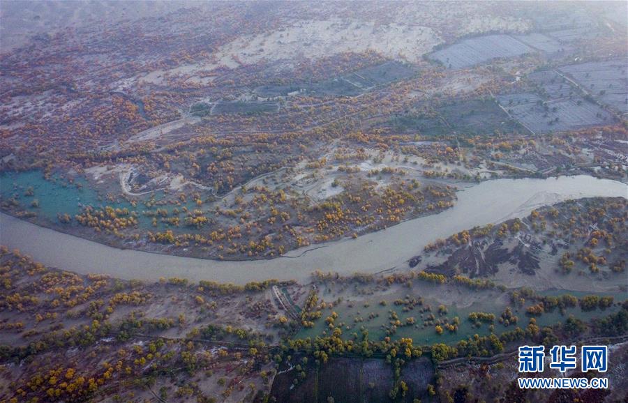 这是10月16日拍摄的从空中俯瞰新疆尉犁县的胡杨(无人机拍摄)。 新华社记者 赵戈 摄
