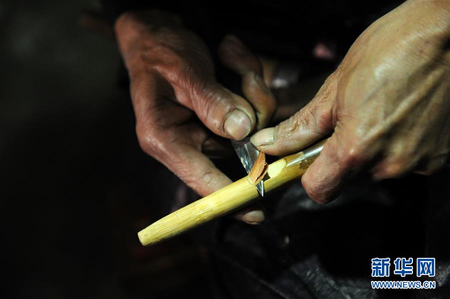 芦笙制作手艺人梁泽光在削制芦笙管的孔洞(10月16日摄)。 贵州省黔东南苗族侗族自治州从江县贯洞镇今影村是当地远近闻名的芦笙制作村,至今仍保存着祖辈传承下来的传统芦笙制作技艺。该制作技艺包括选择材料,准备竹管,安装簧片,凿按音孔,试音等30多道工序。 芦笙是我国西南少数民族地区群众喜爱的一种古老乐器。逢年节日,人们都要举行各式各样的芦笙会,吹起芦笙跳起舞。 新华社发(杨文斌摄)