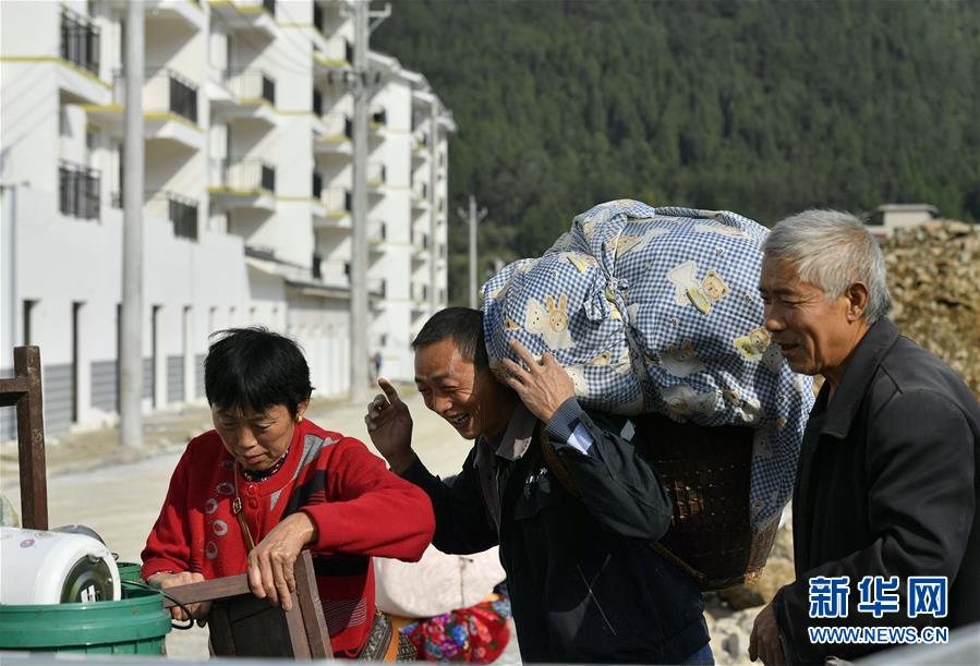 10月15日,在湖北省宣恩县沙道沟镇松坪安置点,易地扶贫搬迁农民在搬家。 新华社发(宋文 摄)