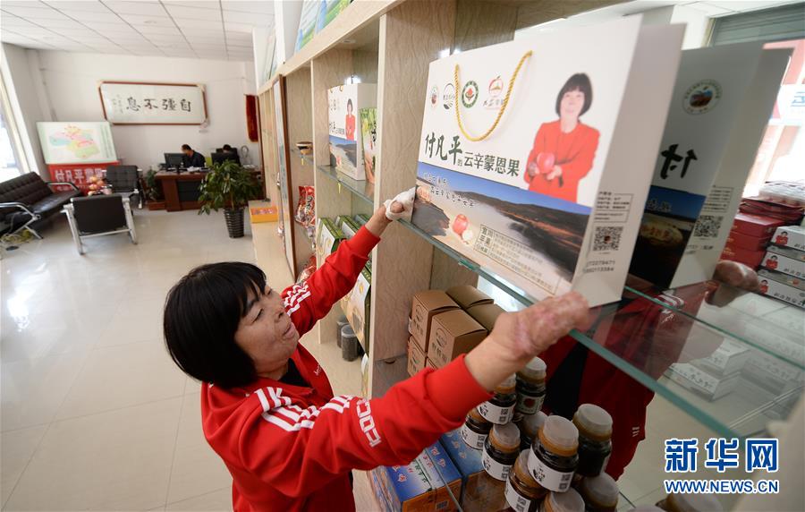 付凡平在位于宜川县城自己公司的实体店里整理展示柜(10月16日摄)。新华社记者刘潇摄