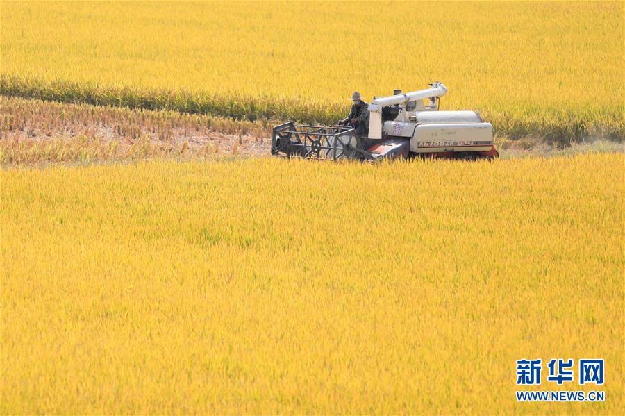 10月18日,农民驾驶收割机在江苏省淮安市盱眙县黄花塘镇老营“虾稻共生”示范基地收获水稻。