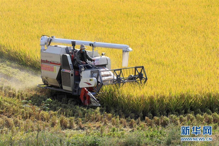 10月18日,农民驾驶收割机在江苏省淮安市盱眙县黄花塘镇老营“虾稻共生”示范基地收获水稻。 新华社发(周海军 摄)