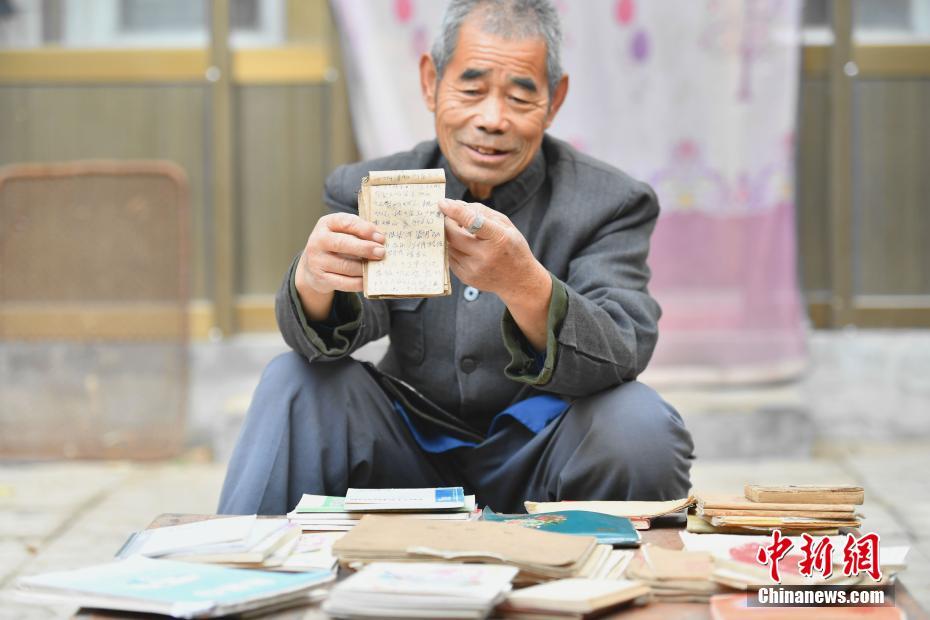 10月18日,河北省藁城市增村镇牛家庄村,76岁的农民贾增文正在展示并介绍他的日记。60年前,贾增文开始写日记,至今一共写了108本。日记如实记录了村里分田到户、第一次领种粮补贴,医保报销、领取养老金等事件。日记记录了老贾一家越过越好的生活,也见证了改革开放40年来,沧海桑田的农村变革。 中新社记者 翟羽佳 摄