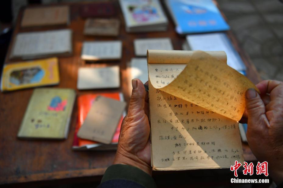 10月18日,河北省藁城市增村镇牛家庄村,76岁的农民贾增文正在展示并介绍他的日记。60年前,贾增文开始写日记,至今一共写了108本。日记如实记录了村里分田到户、第一次领种粮补贴,医保报销、领取养老金等事件。日记记录了老贾一家越过越好的生活,也见证了改革开放40年来,沧海桑田的农村变革。 中新社记者 翟羽佳 摄