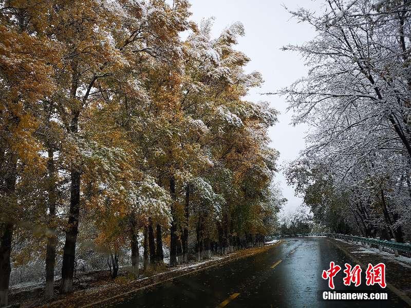 受冷空气影响,10月17日-18日持续降雪给新疆天山天池景区披上白色外衣,景区内白杨树金黄树叶还未落,景区内出现“一黄一白”景致。当天景区游客达1214人,积雪20cm左右。王小军 摄