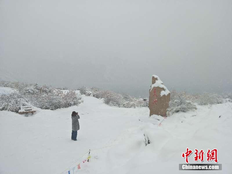 天山天池风景区游客拍雪景。刘英 摄