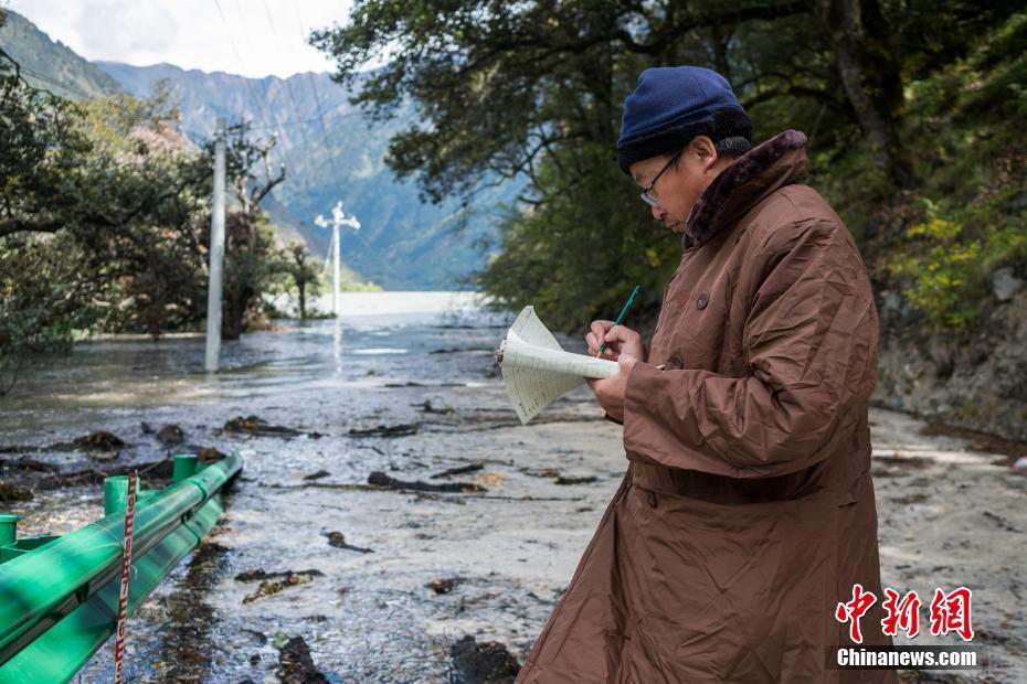 10月18日,通往西藏林芝米林县加拉村的道路被水淹没中断,水文站工作人员正在测量水位。中新社记者 何蓬磊 摄
