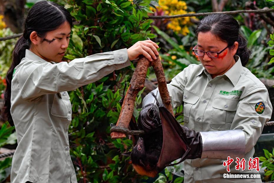10月18日,工作人员为马来大狐蝠称体重。当日,“马来大狐蝠”在广州长隆野生动物世界首次展出。