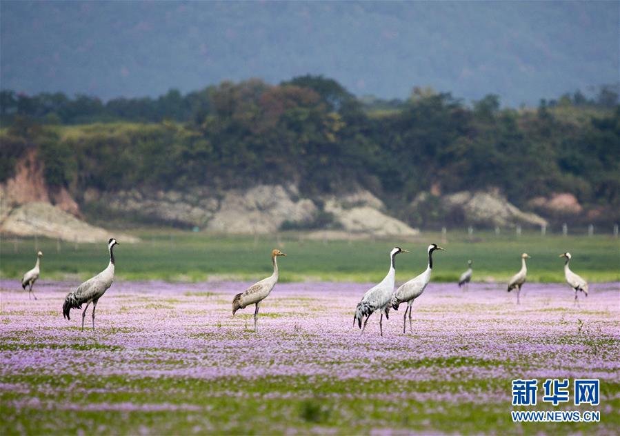 这是10月18日在江西鄱阳湖都昌保护区拍摄的灰鹤。 随着气温逐渐下降,我国最大的淡水湖鄱阳湖迎来越冬鹤群。 新华社发(傅建斌 摄)