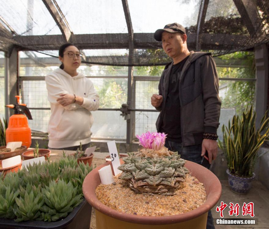 10月19日,温室植物专家冯永平向同事介绍盛开的龟甲牡丹。日前,“植物中的大熊猫”龟甲牡丹在浙江省杭州植物园开花,龟甲牡丹繁殖困难,生长非常缓慢,开花的龟甲牡丹年龄已上百岁。 中新社发 金澍杰 摄