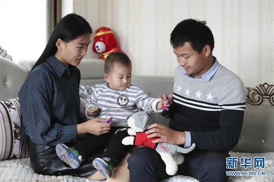 10月20日,下岸村村民杨林涛(右)和妻子杨广博在新居内照顾孩子。 新华社记者 秦晴 摄
