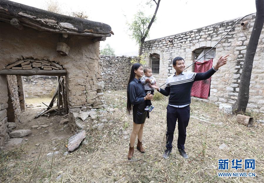 10月20日,下岸村村民杨林涛(右)和妻子杨广博带着孩子回到旧村老宅。 新华社记者 秦晴 摄