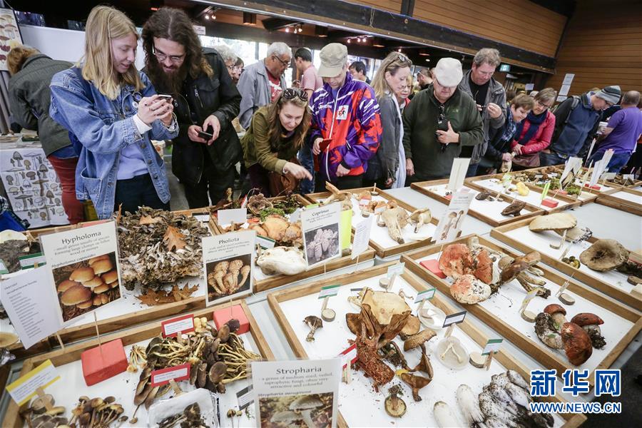 10月21日,在加拿大温哥华,人们观看展出的各种菌菇。 当日,加拿大温哥华举行菌菇展,展出了约300种采摘自温哥华地区的野生菌菇。 新华社发(梁森摄)