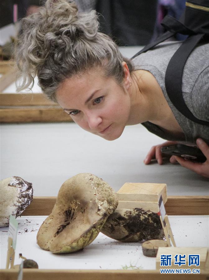 10月21日,在加拿大温哥华,一名女子观看菌菇。 当日,加拿大温哥华举行菌菇展,展出了约300种采摘自温哥华地区的野生菌菇。 新华社发(梁森摄)