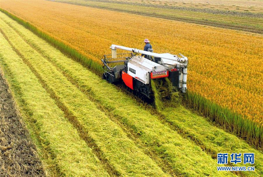 10月22日,山东省临沂市白沙埠镇大墩村村民在收获水稻。 霜降将至,各地农民抢抓农时忙收获,一派繁忙的丰收景象。 新华社发(武纪全 摄)