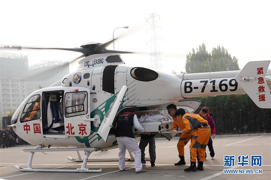 10月22日,工作人员在救援演练中将“新生儿”抬下飞机。 当日,北京儿童医院与999急救中心开展空地一体化新生儿救援演练并签署战略合作协议,双方合作搭建由固定翼飞机、直升机、急救车组成的立体化新生儿转运体系,为北京及周边地区新生儿转运开辟更加畅通的绿色通道。 新华社记者鞠焕宗摄