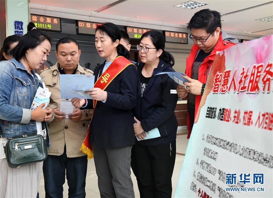 10月23日,在青岛市市南区八大湖街道人力资源和社会保障服务中心,工作人员周波(右三)在为半岛创客孵化基地的创业者介绍如何通过手机申请创业扶持资金。近年来,青岛市人力资源和社会保障部门大力建设完善社保一体化智慧服务平台,把传统的临柜经办、集中经办业务搬到了互联网上,推出的“智慧人社”整合10余个政府部门和众多社会企业信息资源,300多项业务实现网上直办,为单位和个人业务办理提供了更加智能、便捷、高效的服务。新华社记者 李紫恒 摄
