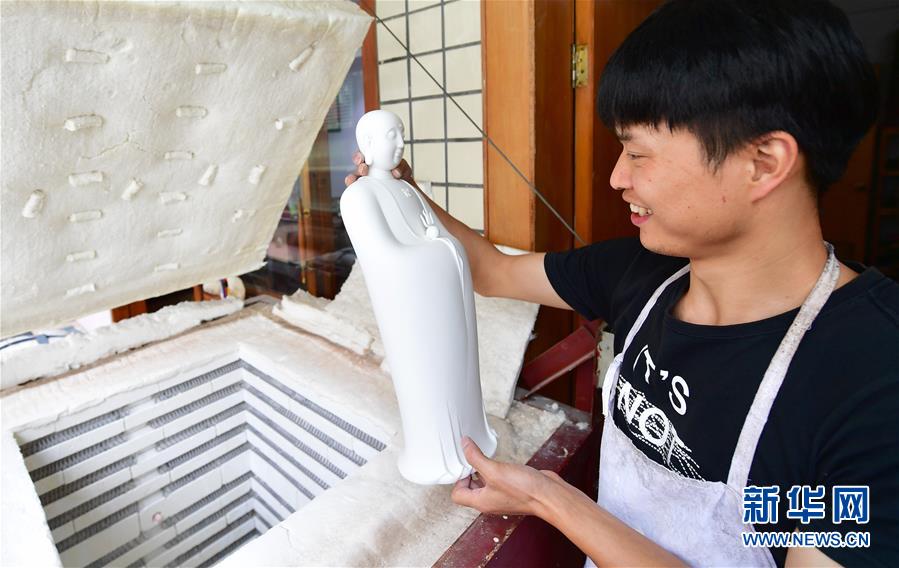 10月23日,王代丁准备把创作好的瓷雕作品放进电炉里烤制。 王代丁和张娜娜是一对“80后”夫妻。2012年,他们从福建泉州工艺美术职业学院毕业后来到德化县自主创业。王代丁在中国陶瓷艺术大师许瑞峰的指导下,学习传统的陶瓷制作手艺,掌握了制作德化瓷雕的基本要领。2016年,王代丁和张娜娜在德化县科技园建起了自己的陶艺工作室。 努力总会有收获,王代丁夫妻创作的瓷雕作品开始陆续在国内获奖,他们已成为当地小有名气的年轻陶瓷艺术家。“我最大爱好就是和泥土打交道,觉得这样才更充实更开心,梦想能把这门瓷雕手艺发扬光大!”王代丁说。 新华社记者魏培全摄
