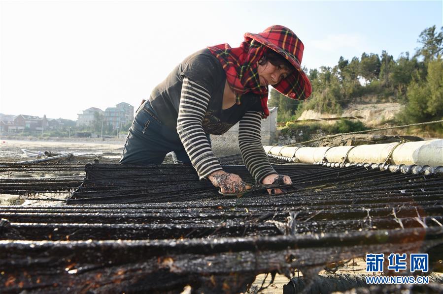 10月24日,福建莆田蒋山村村民在收获紫菜。