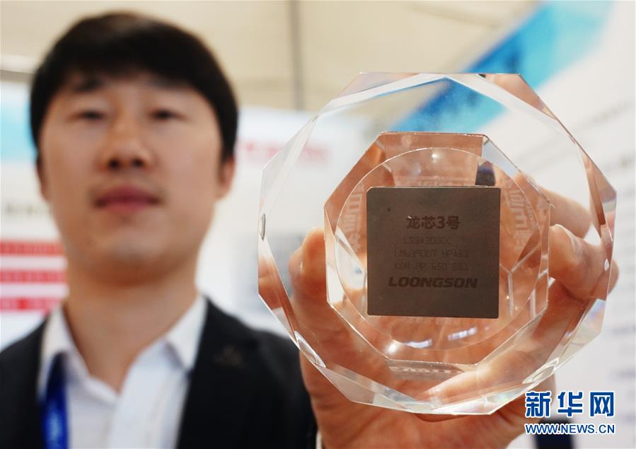 10月25日,工作人员在2018中国计算机大会上展示国产龙芯3号芯片。