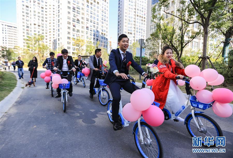 10月27日,用共享单车组成的婚车队经过淮安街头。 当日,江苏淮安的一对新人举办共享单车婚礼。新郎陈凯和新娘吴怡选择骑行共享单车迎亲,富有创意又环保。 新华社发(赵启瑞 摄)