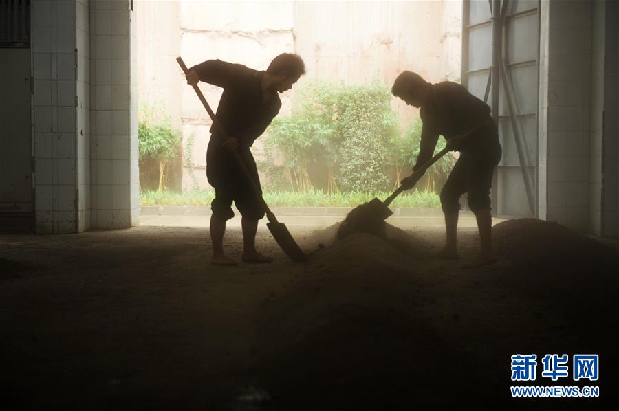 贵州省仁怀市茅台镇茅台酒厂的酿酒工人在对糯高粱酿酒原料进行拌料(10月23日摄)。 重阳节后,位于赤水河畔的贵州省仁怀市茅台镇的各个白酒厂进入酿酒忙碌时节。酿酒工人将糯高粱放入酒甑内蒸煮,按照踩曲、拌料、摊凉、堆积等传统工艺进行酿酒,酿酒车间一派繁忙。 据了解,茅台镇传统工艺酿造酱香型白酒,需经过九次蒸煮、八次发酵、七次取酒,整个酿酒过程一直要持续到次年农历八月底。 新华社发(杨文斌 摄)