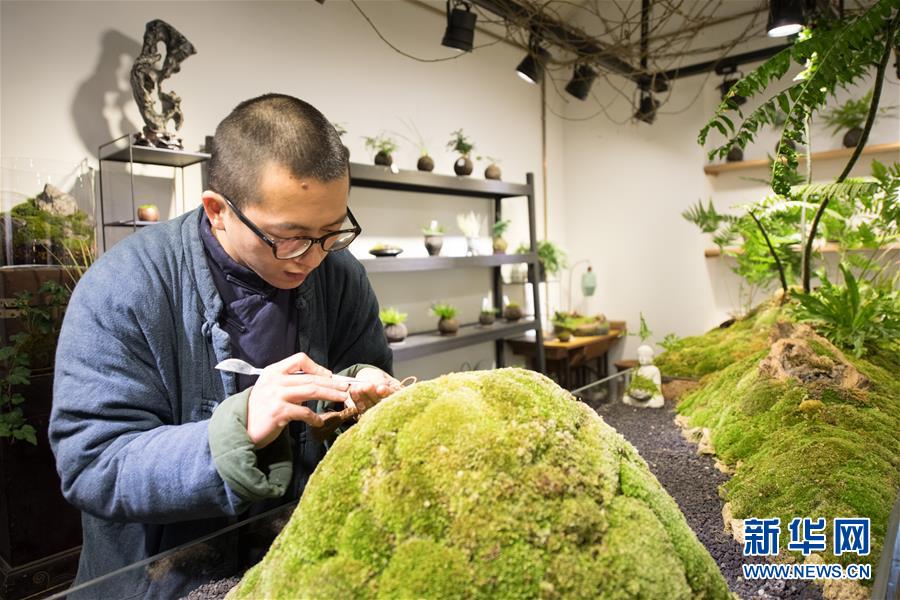 安徽籍艺术家潘锐在2012年创立于杭州市外桐坞村的“植觉”工作室打点苔藓盆景(2018年1月14日摄)。外桐坞村是西湖西面群山中的一个小村落,传统以茶叶生产为主要经济来源。自2010年以来,外桐坞村着力打造艺术村落。 新华社记者 翁忻旸 摄