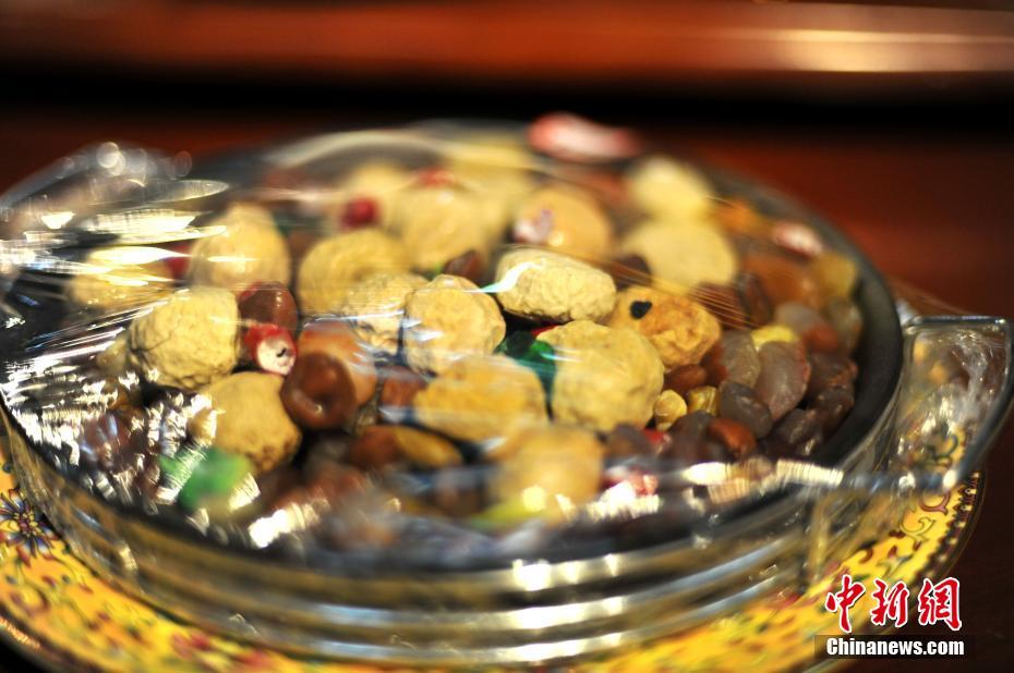 近日,甘肃定西市临洮县奇石博物馆设“满汉全席石头宴”,百余道由石头粒组成的佳肴,道道色泽上佳,形象逼真,令人垂涎欲滴。洮河是中国含沙量最大的河流之一,常年含沙中的“异重沙”,经过千百年的击磨,有的变成了具有粘性的细砂。在细砂冲击的河岸边缘,有大量的五彩卵石,陆离斑驳,千姿百态,构成各种图案。崔琳 摄