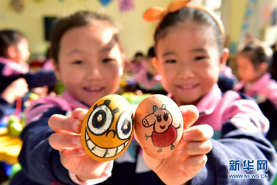 10月31日,河北省新乐市西长寿幼儿园的两名小朋友展示用鸡蛋壳制成的手工作品。 新华社发(贾敏杰 摄)