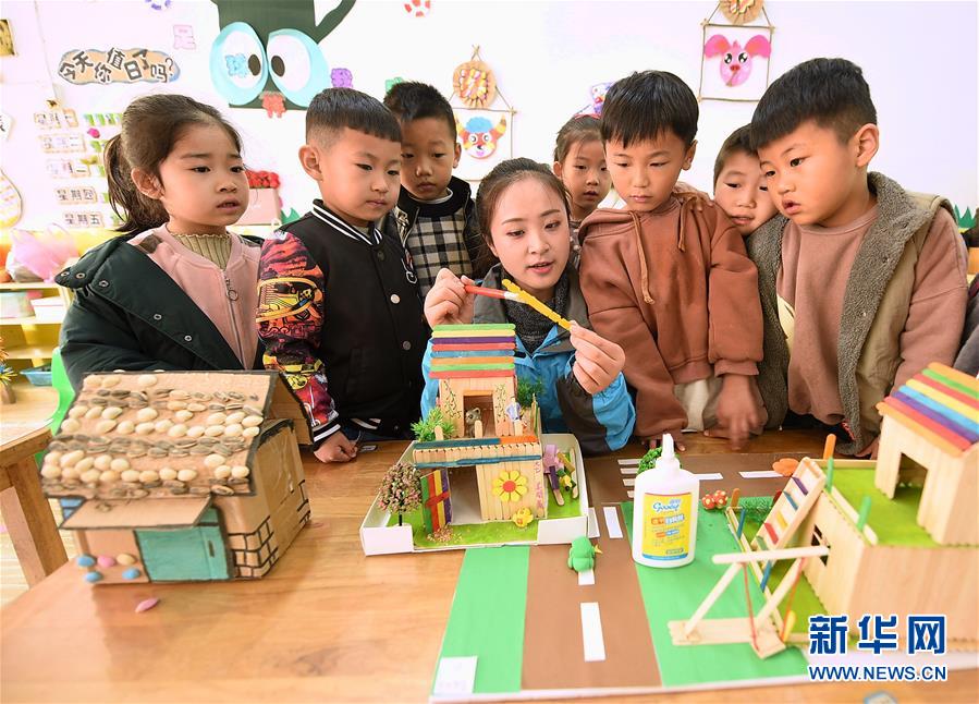 10月31日,江苏省东海县第三幼儿园的老师在指导小朋友们用废弃物制作手工品。 新华社发(张正友 摄)