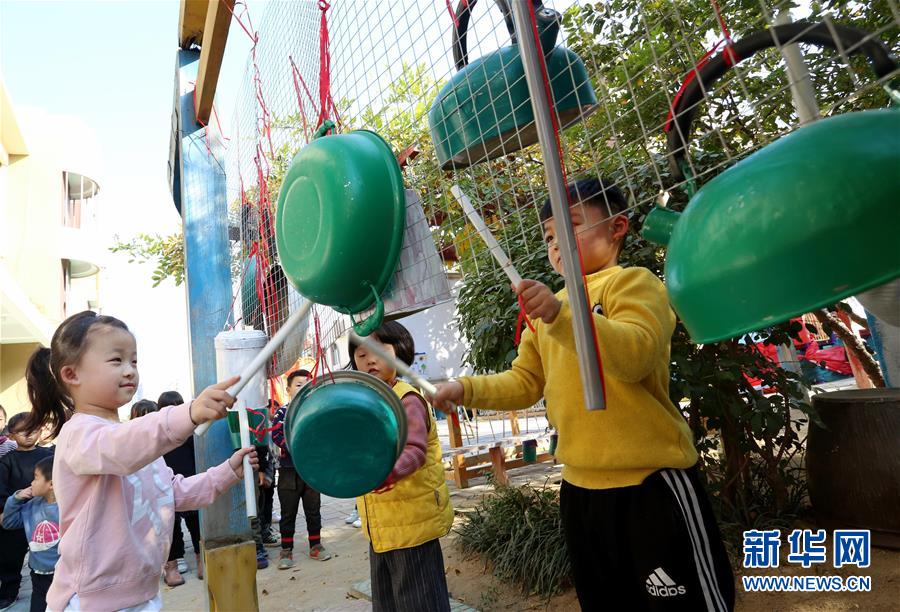 10月31日,江苏省东海县第二幼儿园的小朋友在敲打用废旧物品制作的“乐器”。 新华社发(张开虎 摄)