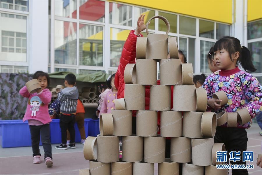 10月31日,江苏省淮安市洪泽湖幼儿园的小朋友使用废旧纸筒搭积木。 新华社发(万震 摄)