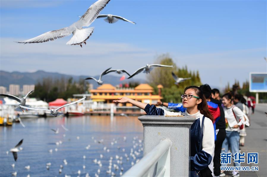 10月31日,人们在昆明市滇池边投喂前来越冬的红嘴鸥。
