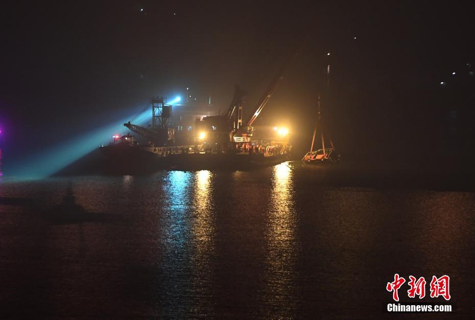 10月31日晚,重庆万州长江二桥坠江公交车被打捞出水。记者在重庆万州坠江公交车救援现场看见,公交车被四条绳索从四个方向包围,车身明显变形,车窗玻璃全部破裂。 中新社记者 陈超 摄