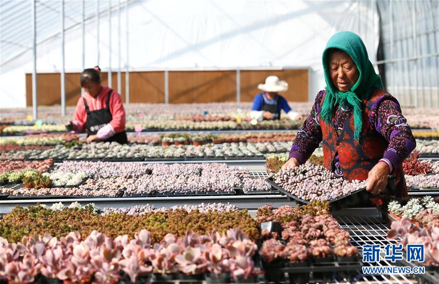 10月31日,山东青岛市即墨区灵山镇中河北村的农民在大棚里管理多肉植物。新华社发(梁孝鹏 摄)