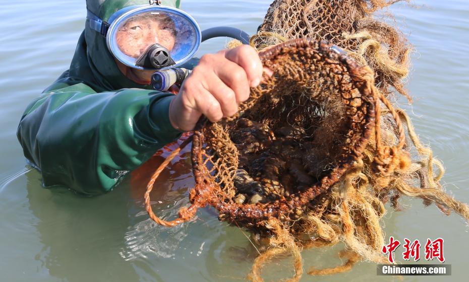 一名“海碰子”在展示刚捕捞出来的野生海参。文/杨毅 图/朴峰